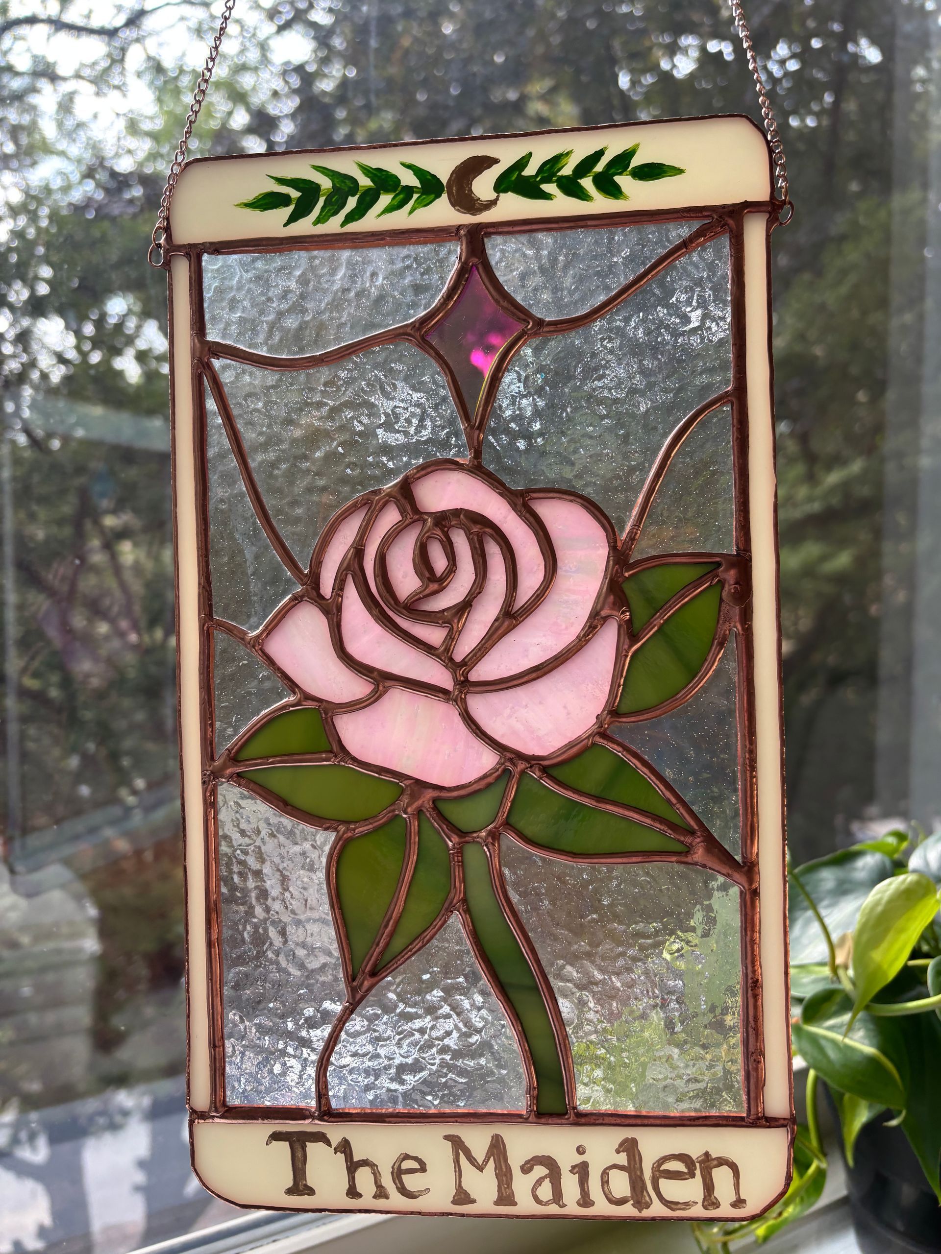 One Dark Window inspired stained glass sun-catcher features textured clear rainbow iridescent treated glass as well as hand painted details. Features a design inspired by The Maiden providence card with a pink iridescent rose, a dichroic firey glass star in the center, and hand painted details to resemble a tarot card. Sun-catcher is approximately 12 inches tall by 6 inches wide.